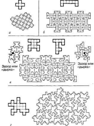 Рассмотренная модель наглядно демонстрирует различие между вычислимостью и детерминизмом. На рис. 3.11 приведены некоторые примеры заполнения плоскости плитками полиомино различных размеров и форм. Легко видеть, что в случаях а и б полное заполнение плоскости осуществляется без труда. В случае в два типа плиток по отдельности не могут заполнить плоскость целиком (на рисунке указаны неизбежно возникающие «зазоры», или «дырки», в покрытии, однако вместе они легко заполняют плоскость). В случае г плоскость можно заполнить плитками одного типа, однако это достигается только за счет достаточно сложной «подгонки».