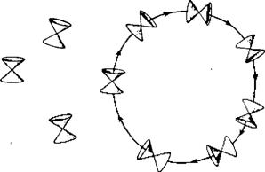 В качестве второго примера появления невычислимости в теориях квантовой гравитации можно сослаться на результаты, содержащиеся в препринте одной из работ Дэвида Дейча. К моему глубокому удивлению, в полном тексте статьи, опубликованной позднее, я не обнаружил этих данных! Я специально беседовал с автором на эту тему, и он заверил меня, что опустил эти результаты не из-за их ошибочности, а лишь потому, что они были не очень важны для статьи в целом. Он считает, что забавные суперпозиции пространства-времени (которые мы должны рассматривать хотя бы в качестве гипотетически возможных) возникают вследствие того, что некоторые из потенциально возможных вселенных могут образовывать замкнутые пространственно-временные линии (рис. 3.13). В таких ситуациях всякие каузальные (причинно-следственные) связи полностью теряют смысл, причины и следствия «бегут по замкнутому кругу», а прошлое и будущее просто перемешиваются друг с другом. Хотя все это выглядит совершенно нереальным и противофактическим, оно (как и в задаче гл. 2, связанной с испытанием бомб) может влиять на действительные события. Я не считаю эти рассуждения достаточно серьезными и убедительными, однако они показывают, что какие-то невычислимые операции могут легко обнаружиться и в совершенно правильных теоретических построениях.