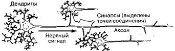Рис. 3.14. Схема работы нейрона, связанного с другими нейронами через синапсы.
