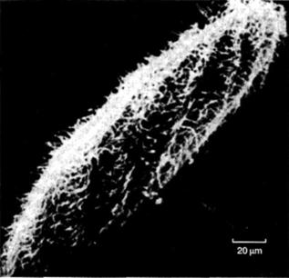 Обратите внимание на тонкие ворсинки (так называемые реснички), используемые для плавания, которые формируют внешнюю оболочку инфузории — цитоскелет.
