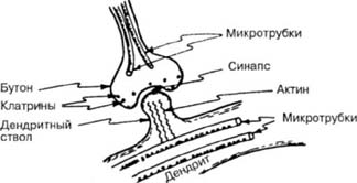 Клатрины (и окончания микротрубок) входят в состав так называемого синаптического окончания аксона, имеющего форму бутона, и существенным образом влияют на величину силы синапса. Это влияние осуществляется посредством актиновых волокон в дендритных отростках.