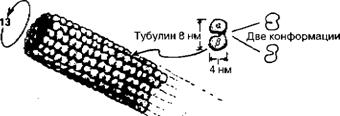 Рис. 3.18. Микротрубка имеет вид полого цилиндра, обычно составленного из 13 «колонок» димеров тубулина.