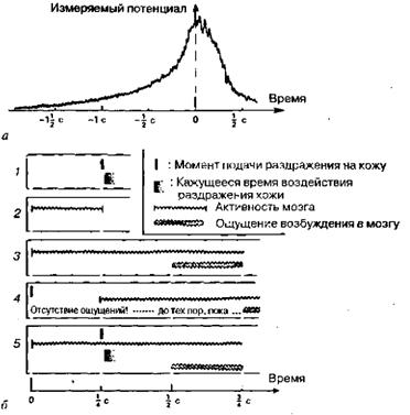 а — результаты опытов Корнхубера, позднее модифицированных и повторенных Либетом и его группой. В момент t = 0 испытуемый принимает решение согнуть палец, однако предварительные сигналы (данные усреднены по многим испытаниям) показывают, что «предвиденье» намерения возникает в мозгу раньше; б — эксперименты группы Либета. 1 — испытуемому «кажется», что раздражение кожи совпадает по времени с истинным моментом подачи раздражающего сигнала; 2 — в кору мозга раздражение поступает на полсекунды раньше, чем истинный сигнал раздражения; 3 — в мозгу раздражение «обгоняет» сигнал истинного раздражения более чем на полсекунды; 4 — такое же раздражение в мозгу может обеспечить «обратную маскировку» ранее поданного раздражения кожи, демонстрируя, что это раздражение якобы не происходит одновременно с раздражением в мозгу; 5 — если реальное раздражение кожи осуществляется немного позднее сигнала в мозгу, то «кожное восприятие» сдвигается по времени назад в отличие от осознанного восприятия.