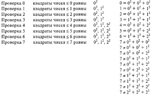 Под числом я подразумеваю натуральное число (типа 0, 1,2, 3, 4, 5, ...), а под «квадратным числом» — квадраты натуральных чисел (типа 02, 12, 22, З2, 42, 52, ...). Я покажу вам сразу, как решается эта задача. Метод может показаться очень простым и даже примитивным, но он как раз дает неплохое представление о сущности того, что мы подразумеваем под вычислениями. Начнем с нуля и проверим, является ли он суммой трех квадратных чисел, для чего просто рассмотрим квадраты всех тех чисел, которые меньше или равны нулю. Естественно, мы имеем лишь одно такое квадратное число, а именно 02, в результате чего можем записать