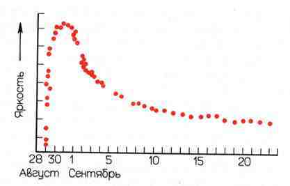 Рис. 9.7. Вспышка Новой в созвездии Лебедя 29 августа 1975 года. Точки соответствуют отдельным измерениям блеска.