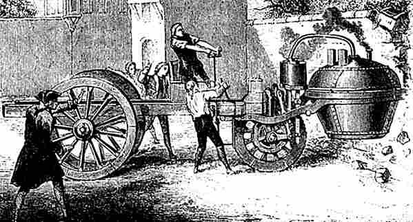 Никола Жозеф Кюньо демонстрирует свою «паровую телегу» - экспериментальный паровой артиллерийский тягач
