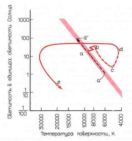 Рис. 9.5. Возникновение белого карлика. Более массивная компонента (две солнечных массы) движется из точки а, менее массивная (одна солнечная масса) — из точки а на главной последовательности. Более массивная компонента развивается быстрее и первой заполняет свою полость Роша (точка b). Отдавая массу своей спутнице, она по штриховой красной кривой переходит в точку d, где передача массы заканчивается. Звезда, у которой осталось всего 0,26 массы Солнца, переходит в точку е и становится белым карликом. Ее спутница переходит по главной последовательности вверх в точку d. (См. также рис. 9.6.)