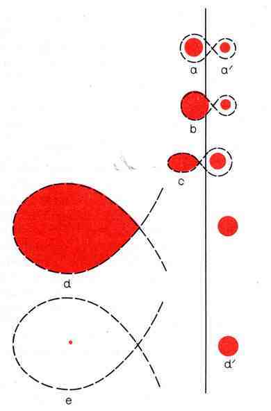 Рис. 9.6. Наглядное изображение эволюции звезд, показанной на диаграмме Г-Р на рис. 9.5. Буквы соответствуют точкам на диаграмме рис. 9.5. Полость Роша для каждой из звезд указана черной штриховой линией. Видно, что в результате массообмена расстояние между звездами может заметно измениться; соответственно изменяется и объем полости Роша. Вертикальная линия на рисунке соответствует оси вращения двойной системы. В результате эволюции вместо двух звезд главной последовательности (вверху) получаются (внизу) одна звезда главной последовательности (справа) и крошечный белый карлик (слева).