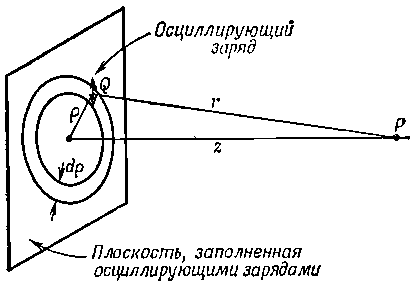 Фиг. 30.10. Поле излучения осциллирующих зарядов, заполняющих плоскость.
