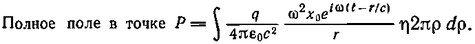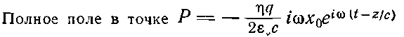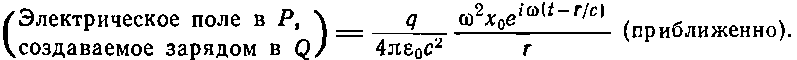 Чтобы найти поле, создаваемое всеми зарядами в точке Р, нужно вычислить сначала поле отдельного заряда q, а затем сложить поля всех зарядов. Как известно, поле излучения пропорционально ускорению заряда, т. е.. — ?2x0еi?t (и одинаково для всех зарядов). Электрическое поле в точке Р, создаваемое зарядом в точке Q, пропорционально ускорению заряда q, нужно только помнить, что поле в точке Р в момент времени t определяется ускорением заряда в более ранний момент времени t'=t-r/c, где r/c — время, за которое волна проходит расстояние от Q до Р. Поэтому поле в точке Р пропорционально
