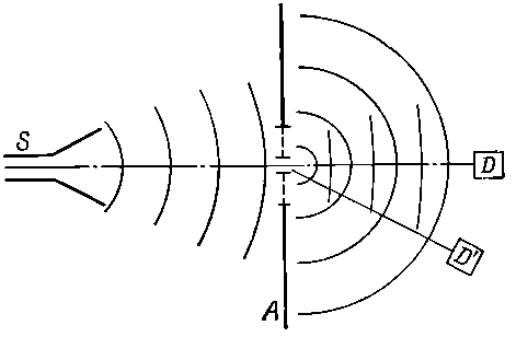 Но если теперь отодвинуть детектор в точку D', то при широкой щели волны не пойдут из S в D', потому что они сравнят близлежащие пути и скажут: «Нет, друг мой, все эти пути требуют другого времени». С другой стороны, если оставить только узенькую щелку и таким образом помешать волнам выбирать путь, то окажутся годными уже несколько путей и волны пойдут по ним! Если щель узкая, в точку D' попадет больше излучения, чем через широкую щель! Такой же опыт возможен со светом, но в большом масштабе его проделать трудно. Этот эффект, однако, можно наблюдать в следующих простых условиях. Найдите маленький и яркий источник света, например уличный фонарь, где-нибудь в конце улицы или отражение солнца от колеса автомобиля. Поставьте перед глазами два пальца, оставив для света узенькую щель, и постепенно сближайте пальцы, пока щель полностью не исчезнет. Вы увидите, что свет, который вначале казался крохотной точкой, начнет расплываться и даже вытянется в длинную линию. Происходит это потому, что между пальцами оставлена лишь очень маленькая щель и свет не идет, как обычно, по прямой, а расходится под некоторым углом и в глаз попадает с разных направлений. Если вы будете достаточно внимательны, то заметите еще боковые максимумы и своеобразную кайму по краям.