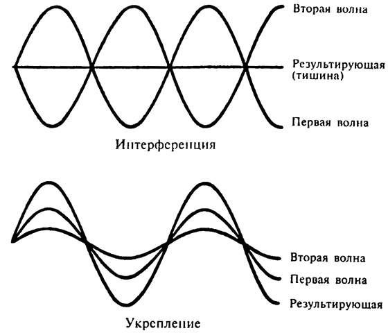 Чтобы еще упростить, предположим, что мы каким-то образом создали две звуковых волны, каждая из которых одной и той же частоты, но звучит таким образом, что отстает от другой на половину длины волны. Всякий раз, когда одна звуковая волна формирует область сжатия в одной точке, другая — формирует там же область разрежения, и наоборот. Два эффекта взаимоуничтожают друг друга, и воздух не двигается. В результате взятые вместе два звука производят тишину; такое явление называется «интерференцией». Трудно представить это себе, если мы говорим о продольных волнах. Однако если изобразить продольные волны как аналогичные им поперечные волны (поскольку для данной цели такая замена вполне приемлема), то интерференцию достаточно легко изобразить. Во всех случаях, когда синусоида одной звуковой волны идет вверх, синусоида другой звуковой волны идет вниз, и если сложить эти два участка, то в результате мы получим ровную линию, то есть никакой волны вообще.