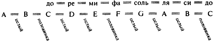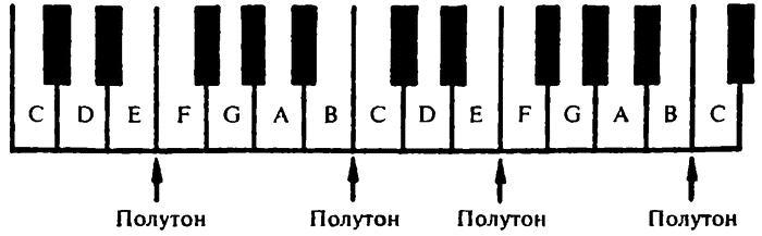 Если мы начнем с А и будем подниматься по октаве вверх через ноты В, С и так далее, то мы будем проходить интервалы в следующем порядке: тон, полутон, тон, тон, полутон, тон, тон, тон, полутон, тон, тон, полутон и так далее. Полутона последовательно отделены двумя целыми тонами, затем — тремя целыми тонами, двумя тонами, тремя тонами и так далее.