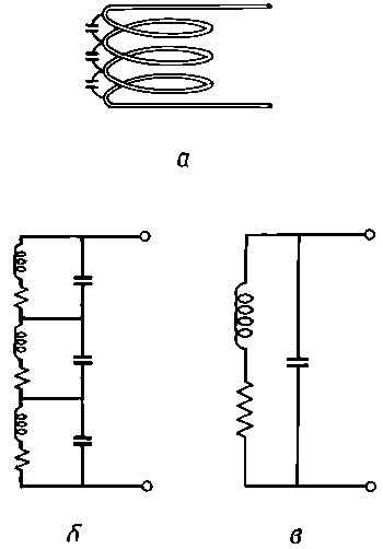 Когда же частота повышается, то уже нельзя представлять реальную катушку в виде индуктивности плюс сопротивление. Начинают играть роль заряды, которые возникают на проводах, чтобы создать напряжение. Дело выглядит так, как будто между витками провода нанизаны маленькие конденсаторчики (фиг. 23.3, а).