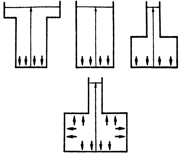Легко видеть, что сосуд с расширенной верхней частью должен испытывать то же самое давление на основание, поскольку верхняя горизонтальная часть сосуда явно содержит дополнительное ее количество. Но отнюдь не кажется логичным тот факт, что сосуд с зауженной верхней частью также должен испытывать то же самое давление на основание. Жидкость, которая отсутствует из-за сужения сосуда, ведь не вносит свой вклад в общее давление? Каким же образом тогда получается, что величина давления остается такой же, как если бы жидкость там присутствовала?