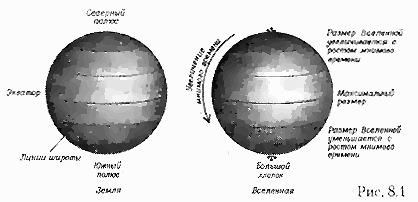 Если принять условие отсутствия границ, то оказывается, что вероятность развития Вселенной но большинству возможных историй пренебрежимо мала, но существует некоторое семейство историй, значительно более вероятных, чем остальные. Эти истории можно изобразить в виде как бы поверхности Земли, причем расстояние до Северного полюса соответствует мнимому времени, а размеры окружностей, все точки которых равно удалены от Северного полюса, отвечают пространственным размерам Вселенной. Вселенная начинается как точка на Северном полюсе. При движении на юг такие широтные окружности увеличиваются, что отвечает расширению Вселенной с течением мнимого времени (рис. 8.1). Вселенная достигает максимального размера на экваторе, а затем с течением мнимого времени сжимается в точку на Южном полюсе. Несмотря на то, что на Северном и Южном полюсе размер Вселенной равен нулю, эти точки будут сингулярными не более, чем Северный и Южный полюс на поверхности Земли. Законы науки будут выполняться в них так же, как они выполняются на Северном и Южном полюсах Земли.