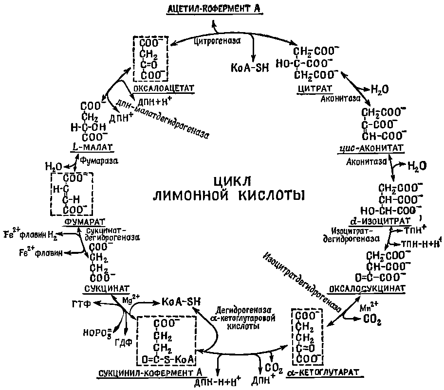 Сам фермент состоит из другого вещества — белка. Молекулы ферментов велики и сложны. Все ферменты отличаются друг от друга, причем каждый предназначен для контроля некоторой определенной реакции. На фиг. 3.1 возле каждой реакции обозначены названия нужного фермента (а иногда один фермент контролирует и две реакции). Подчеркнем, что сам фермент в реакцию не вовлекается. Он не изменяется, его дело только передвинуть атом с одного места в другое. Передвинет в одной молекуле и готов уже заняться следующей. Совсем как станок на фабрике, причем должен иметься запас нужных атомов и возможность избавляться от ненужных. Возьмите, например, водород: существуют ферменты, имеющие специальные ячейки для переноса водорода в любой химической реакции. Скажем, имеются три или четыре фермента, которые понижают количество водорода; они используются во многих местах цикла. Интересно, что механизм, высвобождающий водород в одном месте, придерживает этот атом, чтобы использовать его еще где-нибудь.
