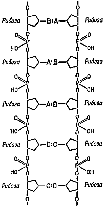 На схеме видны пары поперечных звеньев, присоединенных к сахарным группам и стягивающих между собой две нити. Эти звенья неодинаковы; есть четыре сорта звеньев — аденин, тимин, цитозин, гуанин, обозначаемые A, B, C и D. Интересно, что не всякие звенья спариваются. Например, возможны пары АВ или CD; они размещены на двух нитях так, что «подходят друг к другу», обладают сильной энергией взаимодействия. Но С к А или В к С не подходит; если в цепи стоит С, то в другой цепи в этом месте должно быть только D. Каждой букве в одной цепи соответствует определенная буква в другой.