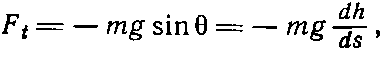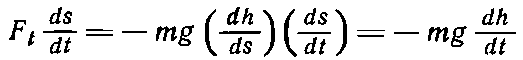 Скорость — это скорость изменения расстояния вдоль кривой ds/dt, а касательная сила Ft теперь оказывается меньше mg в отношении, равном отношению расстояния ds вдоль пути к вертикальному расстоянию dh. Иными словами,