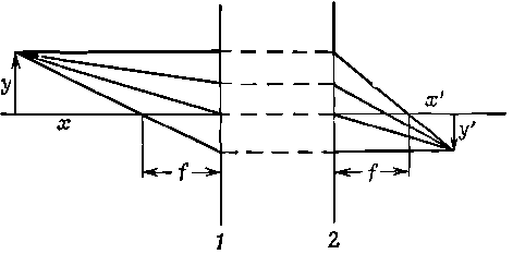 Само собой разумеется, если определить, как и раньше, расстояние х, х' и у, у', то формула (27.16) для тонкой линзы будет применима и в этом общем случае, только фокусные расстояния нужно отсчитывать от главных плоскостей, а не от центра линзы. Для тонкой линзы главные плоскости совпадают. Получается так, как если бы мы взяли тонкую линзу, разрезали её на дольки и разнесли их на некоторое расстояние, а в результате ничего не изменилось. Каждый входящий луч немедленно выскакивает по другую сторону от второй плоскости! Главные плоскости и фокусные расстояния находят либо вычислением, либо опытным путем; этим исчерпывается описание свойств оптической системы. Весьма интересно, что результат для большой и сложной оптической системы оказался таким простым.