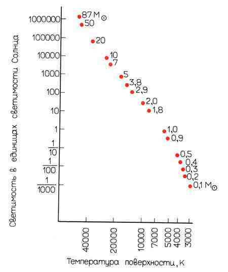 Рис. 4.3. Точками показаны данные для звезд с разной массой, полученные с помощью компьютерной модели. Все звезды состоят из богатой водородом смеси одинакового состава. На диаграмме Г-Р они образуют главную последовательность со всеми свойствами наблюдаемой главной последовательности. Массы звезд выражены в единицах массы Солнца М. Видно, что светимость звезд главной последовательности резко падает с уменьшением массы.