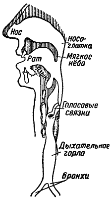 Когда мы дышим, голосовые связки раздвинуты так, что образуют треугольное отверстие, и воздух свободно проходит через него в лёгкие и из лёгких. Когда же мы произносим какой-нибудь звук, особые мышцы сближают упругие голосовые связки, и щель становится узкой. Движение воздуха теперь затруднено, и при выдыхании его перепонки начинают колебаться. Здесь-то и возникает звук. Всё разнообразие звуков нашей речи создаётся уже дальше — на пути от гортани через полости рта и носа.