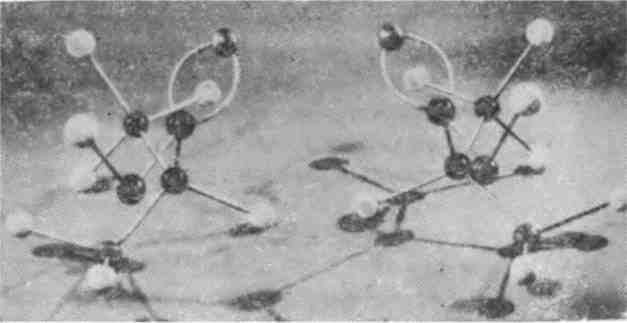 Эта кислота названа аланином, и на фиг. 52.1 (слева) показано расположение атомов в молекуле аланина, выделенного из белка живых существ. Если же мы попытаемся создать аланин из двуокиси углерода, этана и аммиака (что в самом деле можно сделать — это не столь уже сложная молекула), то обнаружим, что получились не только такие молекулы, но и другие, подобные показанной на фиг. 52.1 (справа), причем в равных количествах! Первые молекулы, те, которые произошли от живых существ, называются L-аланином. Другие же, одинаковые с ним химически в том смысле, что состоят из тех же атомов с теми же связями между ними, образуют «правосторонние» молекулы, которые в отличие от «левосторонних» молекул L-аланина называются D-аланином. Интересно, что если мы будем приготовлять аланин в лаборатории из простых газов, то получится смесь обоих сортов в равных количествах. Жизнь, однако, использует только L-аланин. (Но не без исключения, конечно: то там, то здесь в живых существах встречается и D-аланин, однако эти случаи очень редки. Во все белки входит исключительно L-аланин.) Если мы приготовим оба сорта и будем этой смесью кормить животных, которые любят «есть» его (т. е. усваивают аланин), то окажется, что они не смогут использовать D-аланин, а «съедят» только L-аланин. В результате получится то же, что и с нашим сахаром; после того как бактерии «съедят» тот сахар, который им нравится, остается только «ненастоящий» сорт! (Левосторонний сахар тоже сладкий, а все же не такой, как настоящий, правосторонний!)