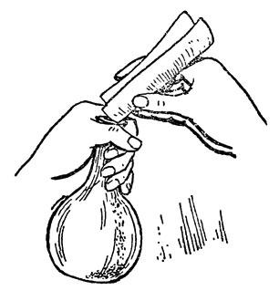 Особенно внимательно следует производить эту операцию с веществами, взрывающимися при ударе или в смеси с другими веществами, например, при измельчении бертолетовой соли. Растворяют обращенные в порошок твердые вещества, ссыпая их с листа бумаги (рис. 56) в колбу, которую держат наклонно.