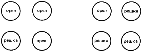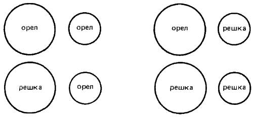 Представим теперь, что мы подбрасываем два новеньких десятицентовика. Очевидно, шансы на выпадение двух «орлов» должны остаться теми же, т. е. один к четырем. Вообще сохраняются в точности те же четыре возможности, однако две из них теперь одинаковы, а именно: когда одна монета упадет «орлом», другая «решкой». Это наводит нас на мысль, что имеются всего три различающихся между собой случая: два «орла», «орел» и «решка», и две «решки». В результате мы можем прийти к ошибочному выводу о том, что шансы на выпадение двух «орлов» составляют не один к четырем, а один к трем. Допустить подобную ошибку действительно нетрудно, но позорна она только для специалистов.