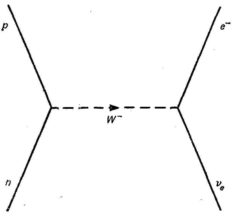 На рис. 17 показан типичный процесс, обусловленный слабым взаимодействием. Экспериментатор наблюдает его при столкновении (рассеянии) нейтрона (n) и нейтрино (нюе), когда обе частицы превращаются в протон (р) и электрон (е). При более детальном описании с использованием частиц-переносчиков d-кварк в нейтроне превращается в u-кварк (тем самым нейтрон превращается в протон) с испусканием виртуальной частицы (на диаграмме показана пунктиром), которая затем поглощается нейтрино (при этом нейтрино превращается в электрон). Так как протон обладает положительным электрическим зарядом, виртуальная частица должна уносить отрицательный заряд (по закону сохранения электрического заряда). Этот отрицательный заряд “оседает” на электроне. Отрицательно заряженный переносчик слабого взаимодействия получил название W–чacтицы. Должна существовать и положительно заряженная античастица W+, которая служила бы переносчиком слабого взаимодействия, например, от антинейтрона к антинейтрино.