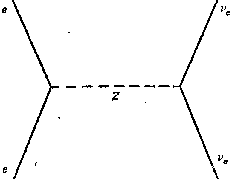 Частицы W+ и W– являются переносчиками двух из трех связанных со слабым взаимодействием полей, предсказанных теорией Вайнберга – Салама. Третье поле соответствует электрически нейтральной частице-переносчику, получившей название Z-частицы. Когда теория Вайнберга – Салама была сформулирована впервые, мысль о нейтральной частице – переносчике слабого взаимодействия была новой. Существование Z-частицы означало бы, что слабое взаимодействие могло бы не сопровождаться переносом электрического заряда. Пример такого процесса приведен на рис. 18: электрон и нейтрино рассеиваются, обмениваясь Z-частицей. В 1973 г. в длительном эксперименте, проведенном в ЦЕРНе, было продемонстрировано существование нейтральных переносчиков слабого взаимодействия. Этот результат поднял престиж теории Вайнберга – Салама.