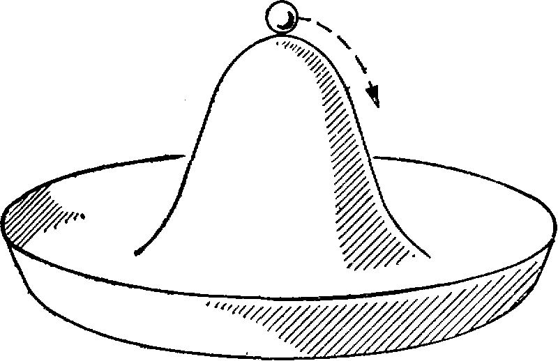 Рис.19. Спонтанное нарушение симметрии. Шарик помещен на вершину поверхности, имеющей форму мексиканского сомбреро. Такая система обладает полной вращательной симметрией, но она неустойчива, и шарик самопроизвольно скатывается на поля “сомбреро”, останавливаясь в произвольной точке. Вращательная симметрия при этом нарушается. Система обретает устойчивость ценой потери симметрии.