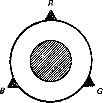 Рис.20. Волшебная ручка с тремя указателями позволяет объяснить более сложную калибровочную симметрию, связанную с цветом кварков. Вращение ручки не сказывается на взаимодействии кварков (осуществляемом путем обмена глюона), но приводит к изменению цветов красного (R), синего (B) и зеленого (G) кварков.