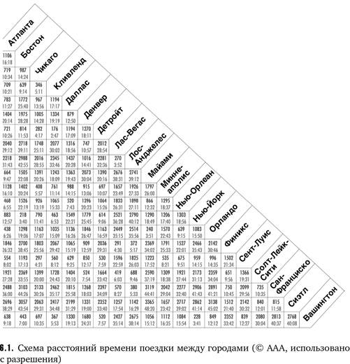 Чтобы оценить организующую силу пространства, не нужна сложная система движущихся, взаимодействующих элементов. Посмотрим на географию какой-нибудь страны. Можно представить города так, словно они расположены на карте, а можно выразить их взаимную пространственную связь в виде схемы расстояний в милях, которая нередко встречается в картах дорог и атласах, — прямоугольной или треугольной сетки с расстояниями между городами. Любопытно то, что эти схемы несут в себе скрытые рисунки подобно разрозненным элементам пазла, которые обнаруживают взаимосвязь по мере составления картины.