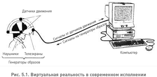Современные видеоигры обеспечивают взаимодействие между игроком и игровыми объектами, но, как правило, используют лишь небольшую часть сенсорного диапазона пользователя. Такая воссозданная «окружающая среда» состоит из изображений на небольшом экране и частично звуков, которые слышит пользователь. Однако уже существуют виртуальные видеоигры, более достойные этого названия. Обычно пользователь надевает шлем со встроенными наушниками и двумя телевизионными экранами (по одному для каждого глаза), иногда — специальные перчатки и другую одежду, оснащённую электрически управляемыми эффекторами (устройствами, создающими давление). Имеются также сенсорные датчики, которые регистрируют движение частей тела пользователя, особенно головы. Информация о том, что делает пользователь, передаётся компьютеру, который вычисляет, что должен видеть, слышать и чувствовать пользователь, и реагирует, посылая соответствующие сигналы генераторам образов (рис. 5.1). Когда пользователь смотрит налево или направо, изображения на двух телевизионных экранах смещаются, подобно реальному полю зрения, и показывают, что находится слева и справа от него в виртуальном мире. Пользователь может протянуть руку и взять виртуальный объект, который будет на ощупь как настоящий, потому что эффекторы перчатки генерируют «тактильную обратную связь», соответствующую положению и ориентации, с которыми виден объект.