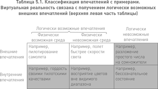 Так какие же физически невозможные среды можно создать в виртуальной реальности? В точности те, которые не отличаются ощутимым образом от физически возможных сред. Следовательно, физический мир и миры, которые можно воссоздать в виртуальной реальности, связаны между собой гораздо теснее, чем это кажется. Мы считаем одни виртуализации описывающими факт, а другие — описывающими вымысел, но вымысел — это всегда интерпретация в мозгу наблюдателя. Не существует такой виртуальной среды, которую бы пользователь вынужден был интерпретировать как физически невозможную.