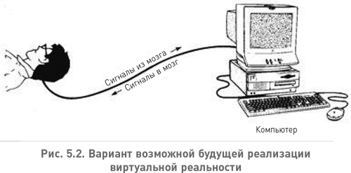 Я должен признать, что говорить о взаимодействии человеческого разума с внешним миром только через испускание и получение нервных импульсов было бы, пожалуй, слишком большой идеализацией. В обоих направлениях проходят и химические сообщения. Я предполагаю, что, в принципе, эти сообщения тоже можно перехватить и подменить в некоторой точке между мозгом и остальным телом. Таким образом, пользователь будет лежать неподвижно, подсоединённый к компьютеру, но у него возникнет ощущение полного взаимодействия с виртуальным миром — по существу, реальной жизни в этом мире. На рис. 5.2 проиллюстрированы эти мои идеи. Кстати, несмотря на то, что такая технология — дело будущего, идея о ней гораздо старее самой теории вычислений. В начале XVII века Декарт уже рассматривал философские следствия манипулирования чувствами со стороны «демона», который, по сути, был генератором виртуальной реальности, подобным показанному на рис. 5.2, но только компьютер заменялся сверхъестественным разумом.