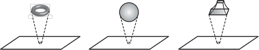 Три разные модели компактификации. То, что выглядит для макроскопического наблюдателя точкой, при ближайшем рассмотрении оказывается пространством большего числа измерений. Слева направо: тор (поверхность бублика), сфера (поверхность мячика), деформированное пространство между двумя бранами. Реальные компактификации будут включать большее количество дополнительных измерений, но это трудно изобразить на рисунке.