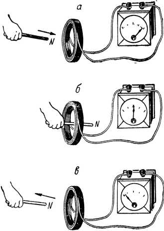 Фарадей вдвигал стержень, и стрелка гальванометра отклонялась в одну сторону, а когда он выдвигал стержень, — стрелка отклонялась в другую сторону. Через гальванометр шел ток, и это был ток, рожденный не другим током, а движением обыкновенного магнита. Цель, которую преследовал Фарадей — «доказать неразрывную связь между электрическими и магнитными явлениями», была достигнута (рис. 28).
