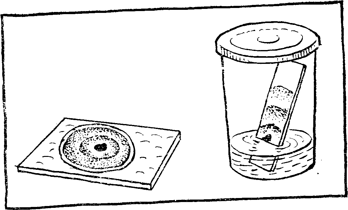 Разболтайте крахмал в небольшом количестве спирта (вновь можно взять изопропиловый спирт), вылейте смесь на стекло и дайте растворителю испариться. Когда пластинка станет сухой, в ее центр, как и на бумагу, капните одну каплю исследуемой смеси; разумеется, она должна быть окрашенной, иначе разделение трудно будет заметить. Объект для эксперимента подберите сами. Помимо того, что было уже названо, годятся окрашенные соки, чернила, гуашевые краски и многое иное.
