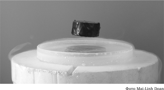 Одна из самых впечатляющих демонстраций, которые можно провести со сверхпроводниками, особенно с новыми высокотемпературными сверхпроводниками, в которых сверхпроводимость проявляется при температуре жидкого азота, состоит в том, чтобы заставить магнит висеть в воздухе над сверхпроводником, как показано на рисунке.