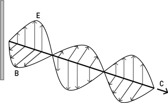 Вспомним, что в электромагнитной волне электрическое (E) и магнитное (B) поля колеблются туда-сюда в направлениях, перпендикулярных направлению движения волны, как показано на рисунке.