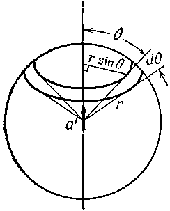 где S — мощность на 1 м2, излучаемая под углом ?. Как уже отмечалось, S обратно пропорционально расстоянию. Интегрируя, получаем отсюда полную мощность, излучаемую во всех направлениях. Для этого сначала умножим S на площадь полоски сферы, тогда мы получим поток энергии в интервале угла d? (фиг. 32.1).