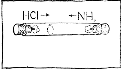 Возьмите не очень широкую стеклянную трубку длиной в несколько десятков сантиметров и подберите к ней две пробки, С внутренней стороны, обращенной к трубке, вставьте в обе пробки по небольшому стеклянному стерженьку и намотайте на них по кусочку ваты. Один кусочек смочите несколькими каплями концентрированной соляной кислоты, другой — концентрированным раствором аммиака. Одновременно вставьте пробки с ватками в трубку с обеих концов. Через несколько минут — в зависимости от длины трубки — в ней, ближе к ватке с соляной кислотой, появится белое кольцо хлорида аммония NH4Cl.
