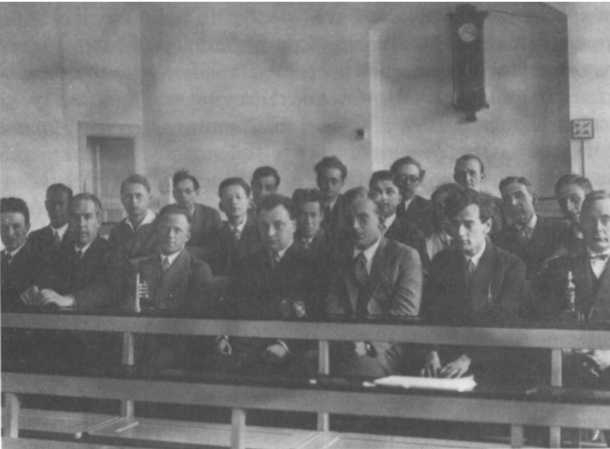 Конгресс в Копенгагене. В первом ряду слева направо: Клейн, Бор, Гейзенберг, Паули, Гамов, Ландау и Крамере, 1930 год.