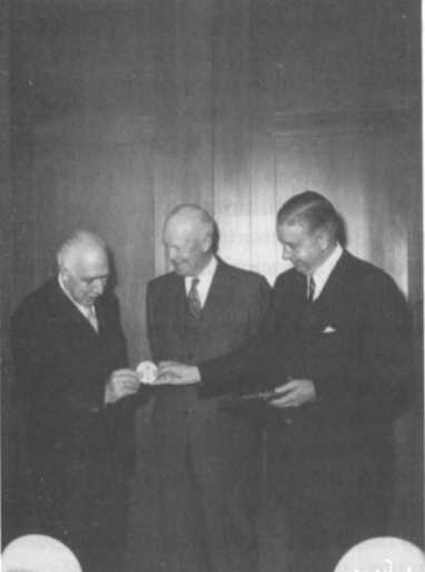 Бор с Эйзенхауэром (в центре) и Генри Фордом II на вручении премии «Атомы во имя мира», 1957 год.