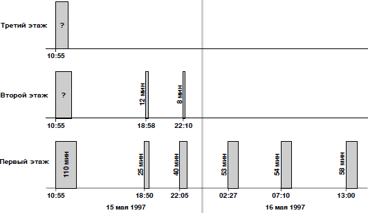 В здании датчики САС были размещены в 12 точках контроля. При возникновении 1-го пика они сработали только в трех ближайших точках: 1) мойка, 1 этаж; 2) ремонтная зона, 2 этаж; 3) склад, 3 этаж. Последовательность пиков, моменты срабатывания и продолжительность состояния превышения порога срабатывания в 10 мкР/с регистрировались оператором на центральном приборном щите (рис. 33).