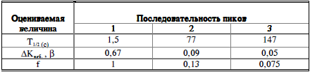 Вышеуказанные три точки контроля расположены одна над другой. Известны расстояния от сборника до каждой из них и кратности ослабления мгновенного гамма-излучения от цепной реакции в бетонных перекрытиях между этажами. Используя эти данные, были оценены периоды удвоения мощности в первых трех пиках Т1/2, введенные избыточные реактивности ?Kизб, отношения (f) полного числа делений в пиках к числу делений в 1-м пике. Эти результаты представлены в таблице 8.