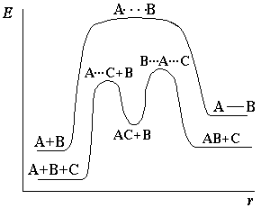 Рисунок 2.1 – Энергетическая диаграмма для реакции образования продукта АВ из исходных веществ А и В. Если энергия столкновения молекул А и В больше или равна энергии активации Еа, то энергетический барьер преодолевается, и происходит перемещение вдоль координаты реакции r от исходных веществ к продукту. Иначе имеет место упругое столкновение молекул А и В. Вершина энергетического барьера соответствует переходному состоянию (активированному комплексу), в котором связь А–В образовалась частично.