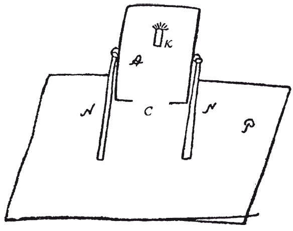 Вот схематическое описание моего прибора. В цилиндре А, имеющем в нижнем дне отверстие С, устанавливается по оси пороховая свечка К (так буду я называть цилиндрики из прессованного пороха). Цилиндр А посредством стоек N прикреплен к средней части платформы Р, за которой должен стоять воздухоплаватель. Для зажигания пороховой свечки, а также для устанавливания новой свечки на место сгоревшей должны быть придуманы особые автоматические механизмы… Все это легко может быть разрешено современной техникой.